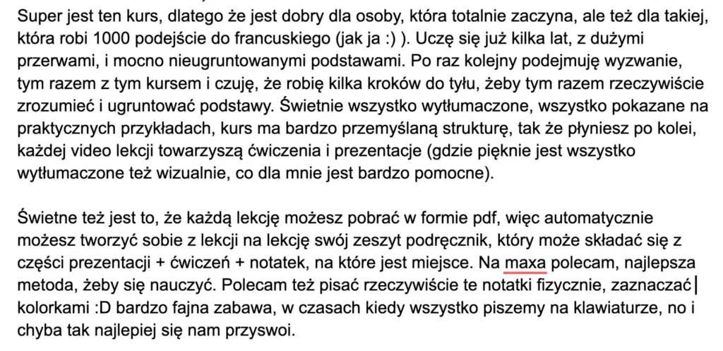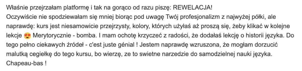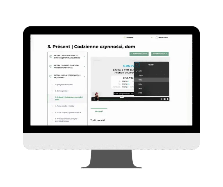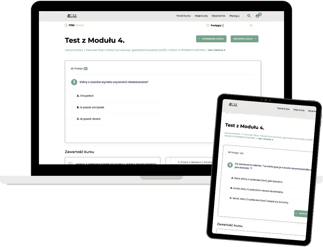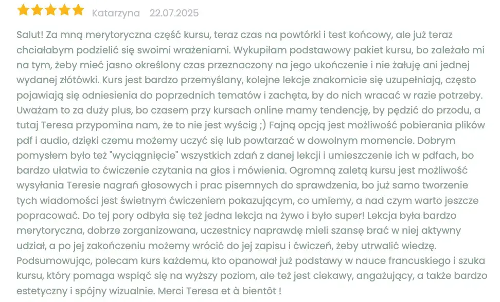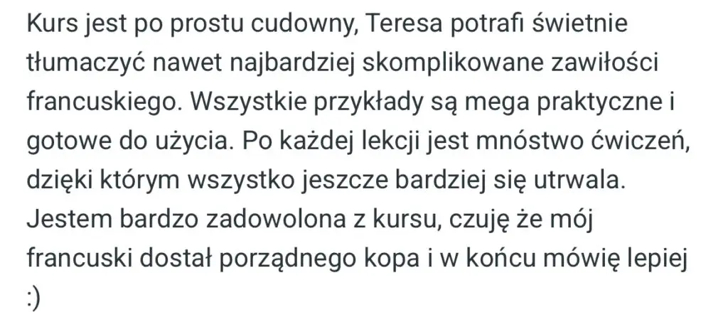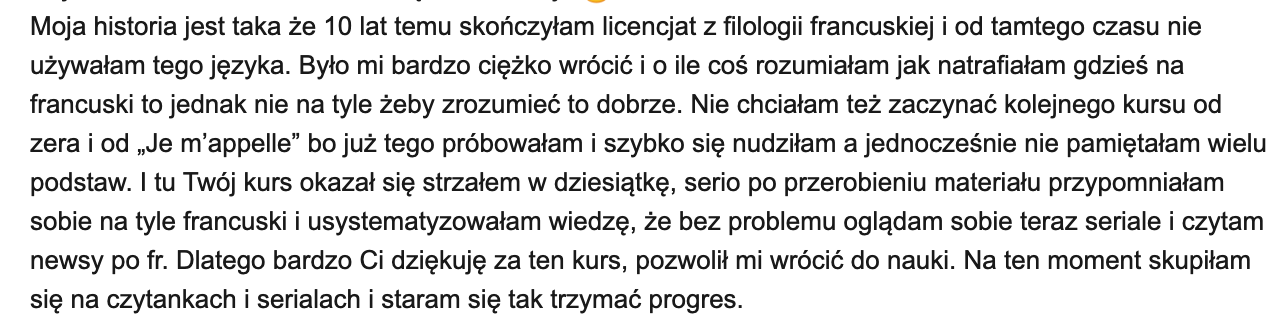 A1: Jeśli znasz podstawowe zwroty i miałaś(eś) już styczność z językiem francuskim (nie jesteś na poziomie absolutnie początkującym), ten kurs będzie Twoim „podręcznikiem” na kolejne lata Polecam kupić opcję dożywotnią. Z moim kursem jako głównym źródłem wiedzy i przy uczciwej i regularnej nauce dojdziesz do zaawansowanego poziomu w półtora roku.