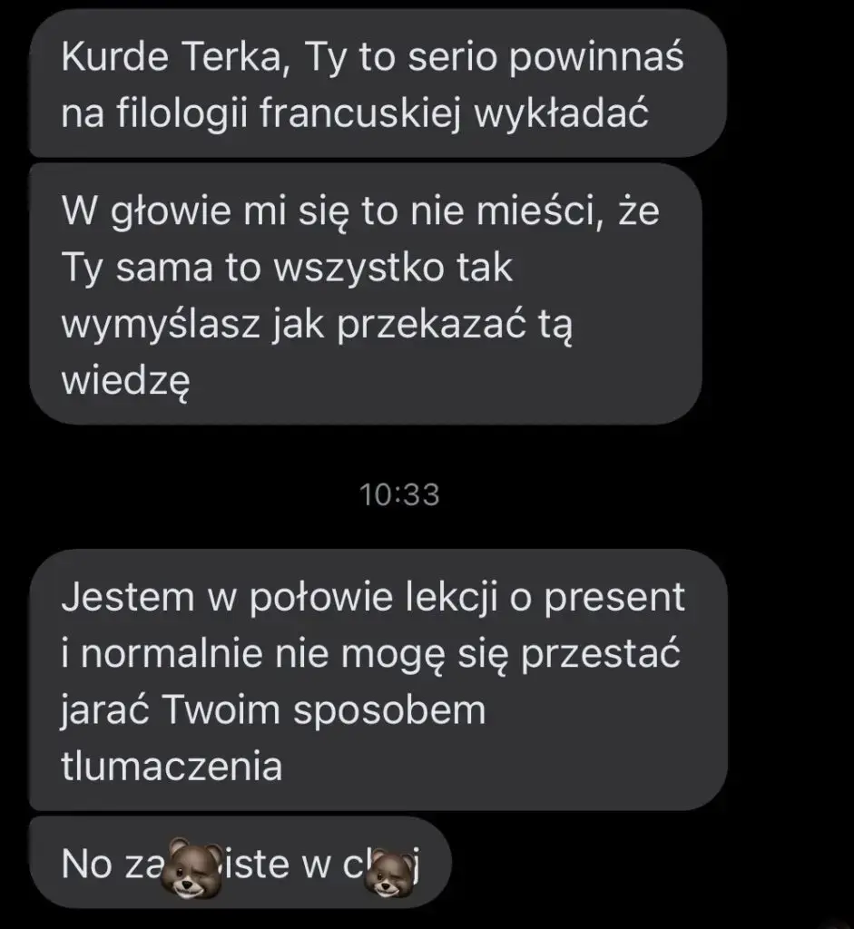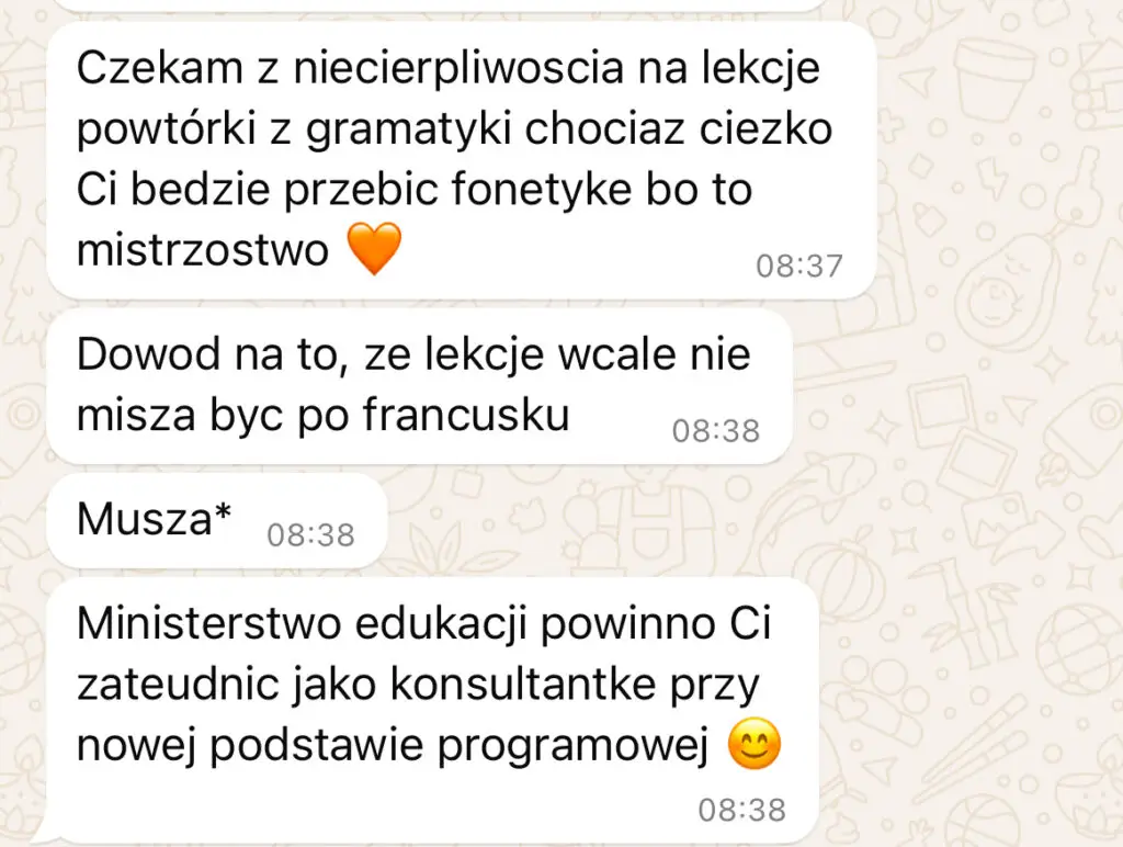 B2: Jeśli masz już bardzo mocne B2, które puka do drzwi C1, więcej skorzystasz kupując kurs ograniczony do lekcji wymowy. Zyskasz dostęp do bardzo cennej wiedzy, która uzupełni Twoją wiedzę i udoskonali umiejętności mówienia i pisania. Zakup całego kursu z kolei pozwoli uzupełnić braki gramatyczne, zrobić generalną powtórkę oraz uporządkować wiedzę. Będzie też okazją do poznania mojego sposobu tłumaczenia języka francuskiego i może być cenną inspiracją do dalszej nauki, która przecież się nigdy nie kończy!
