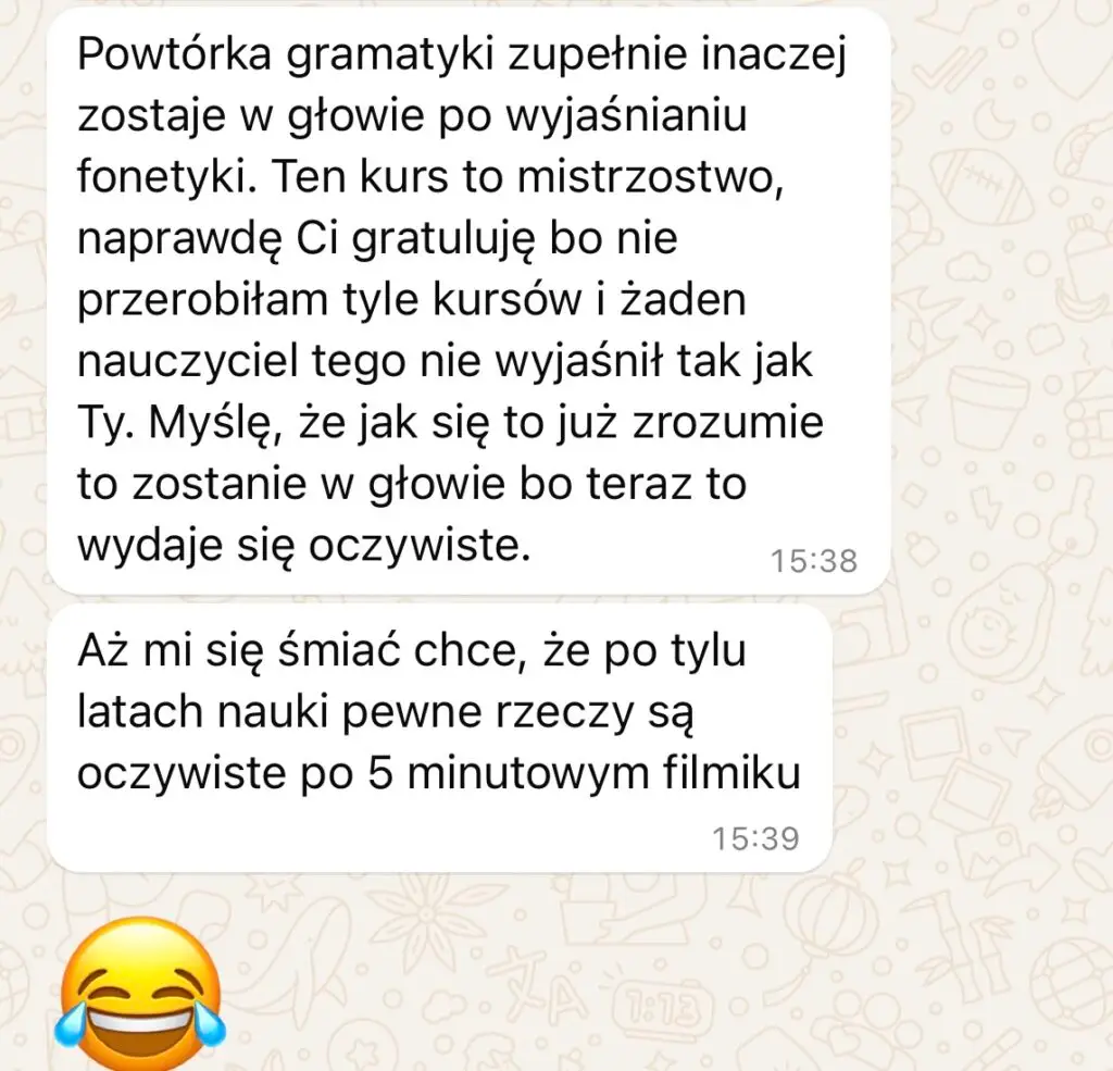 A2: Na tym poziomie blokuje się większość uczniów. Z mojego doświadczenia wynika, że w większości przypadków wynika to ze złego podejścia do nauki i braku powtórek. Wystarczy zadbać o zrozumienie materiału i rzeczywiste wyćwiczenie danego tematu, a progres gwarantowany. Gramatykę, wymowę i ortografię wyjaśniam jak nikt inny, a dzięki odpowiednio zaprojektowanym ćwiczeniom, głosówkom i pracom pisemnym, masz zaprojektowany system nauki. Po Twojej stronie zostaje skorzystanie z tego wszystkiego!
