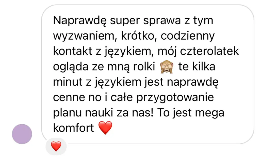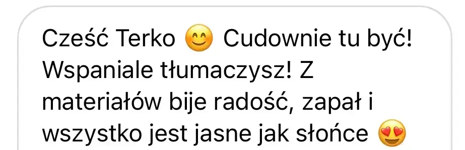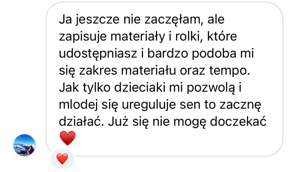 Świetnie skonstruowany kurs w przyjemnej atmosferze, przekazujący mnóstwo wartościowej treści. Zmotywował mnie do dalszej nauki tego pięknego języka! Jestem bardzo zadowolona, serdecznie polecam!