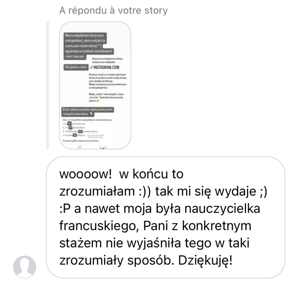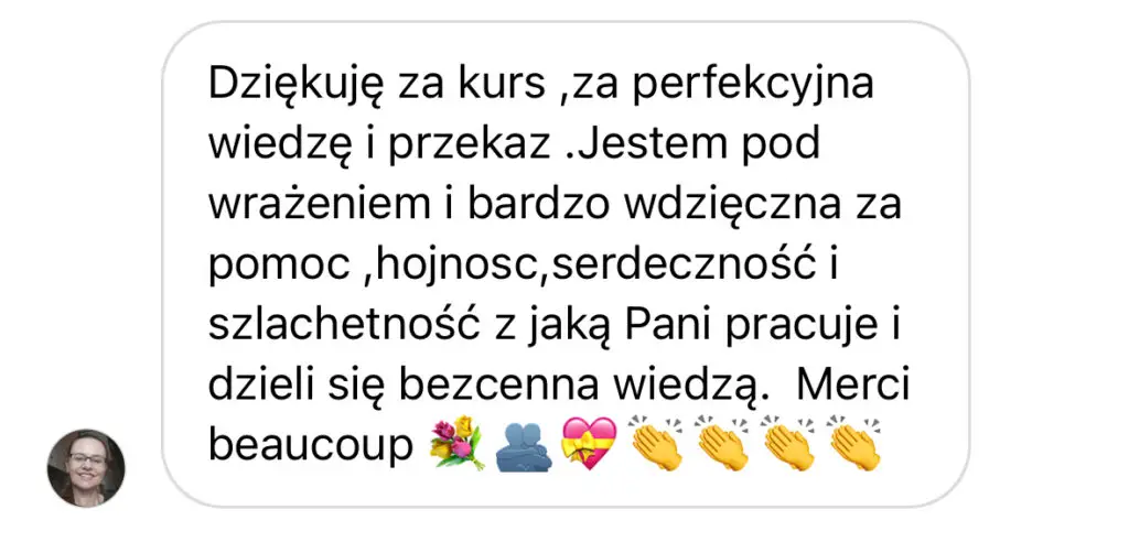 Jestem bardzo zadowolona z kursu. Próbowałam wcześniej uczyć się francuskiego ale nie potrafiłam uporządkować wiedzy. Terka bardzo dokładnie w filmikach pokazała zagadnienia gramatyczne, wytłumaczyła je bardzo jasno i przejrzyście. Ćwiczenia również były nie tylko pomocne ale również pięknie graficznie zaprojektowane. I co najważniejsze – lekcje są krótkie i konkretne – nie ma więc wrażenia zmęczenia oglądaniem ich. Kurs zdecydowanie na plus i czekam na druga część!