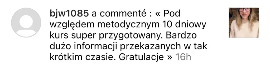 Kurs jest cudowny. Wypełniony wiedzą merytoryczną, a przy tym prowadzony w miłej i sympatycznej atmosferze. Zdecydowanie polecam.