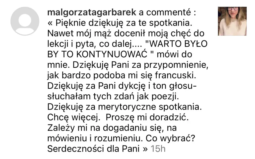 Teresa jest wspaniałą nauczycielką! Dzięki wyzwaniu postanowiłam powrócić do francuskiego po bardzo długiej przerwie. Wyzwanie sprawiło, że chciałam więcej i więcej. 🙂 Teresa wręcz zaraża miłością do francuskiego! Polecam wszystkim – zarówno tym, którzy dopiero zaczynają swoją przygodę z francuskim, jak również tym, którzy powracają do niego po dłuższej przerwie.